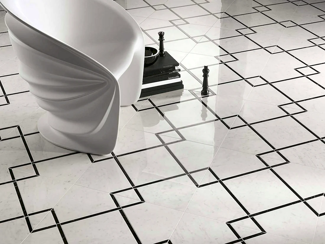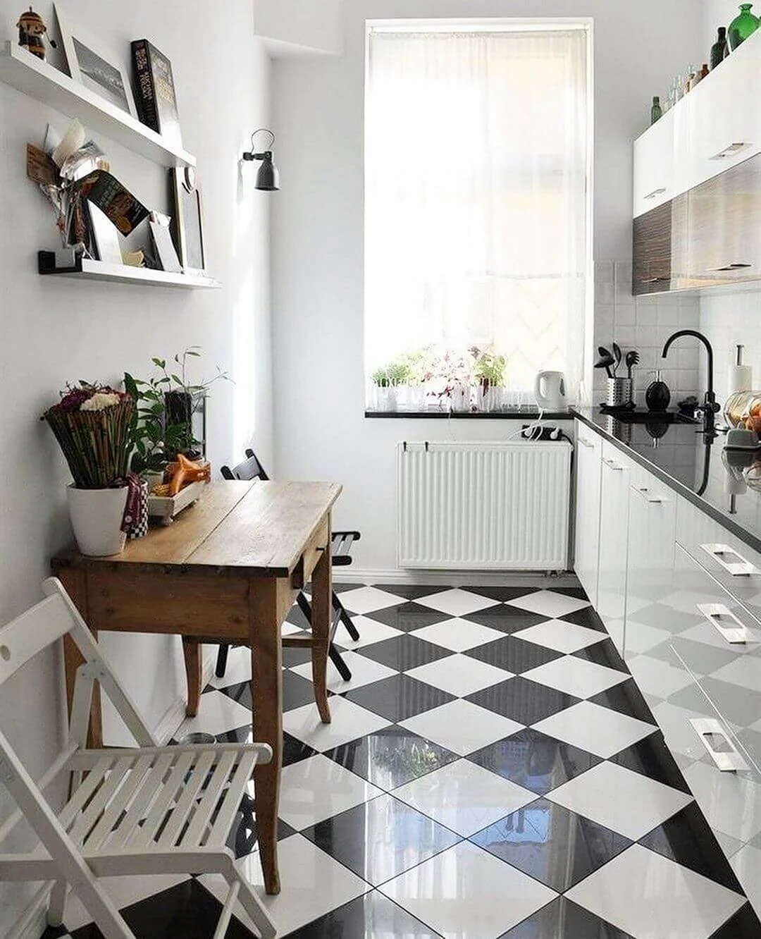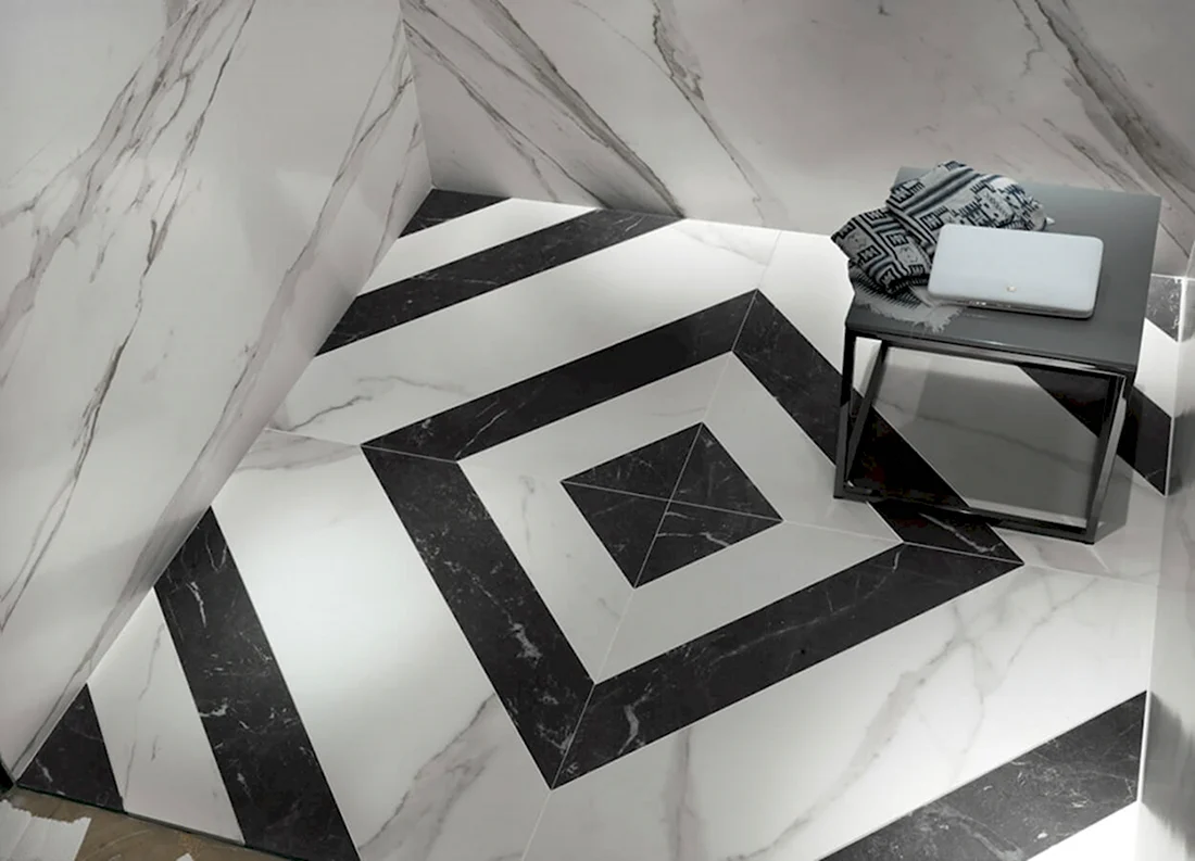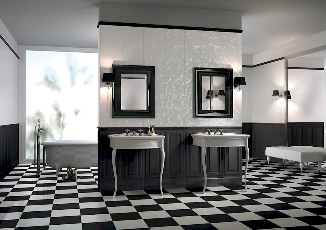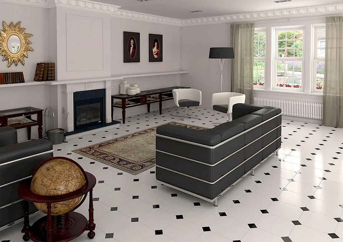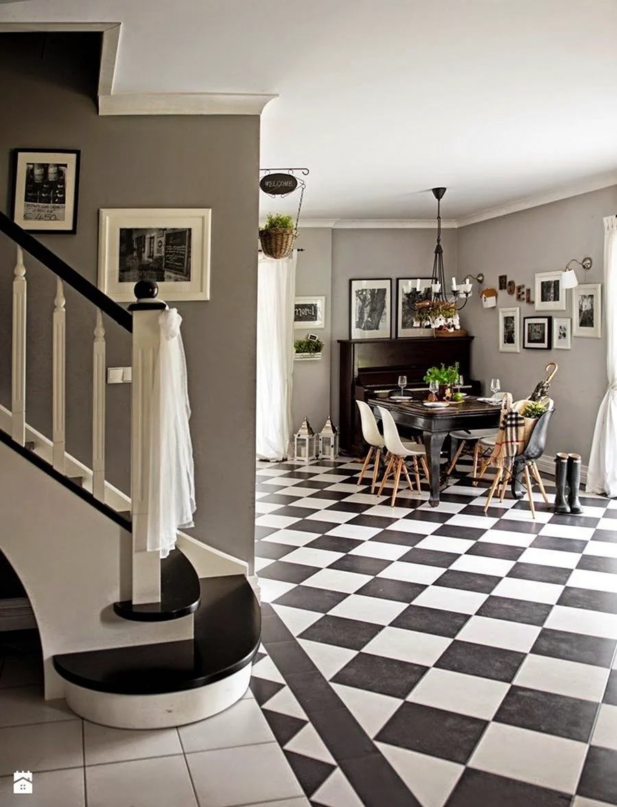 Такие черно-белые узоры на полу придают интерьеру стиль и элегантность.