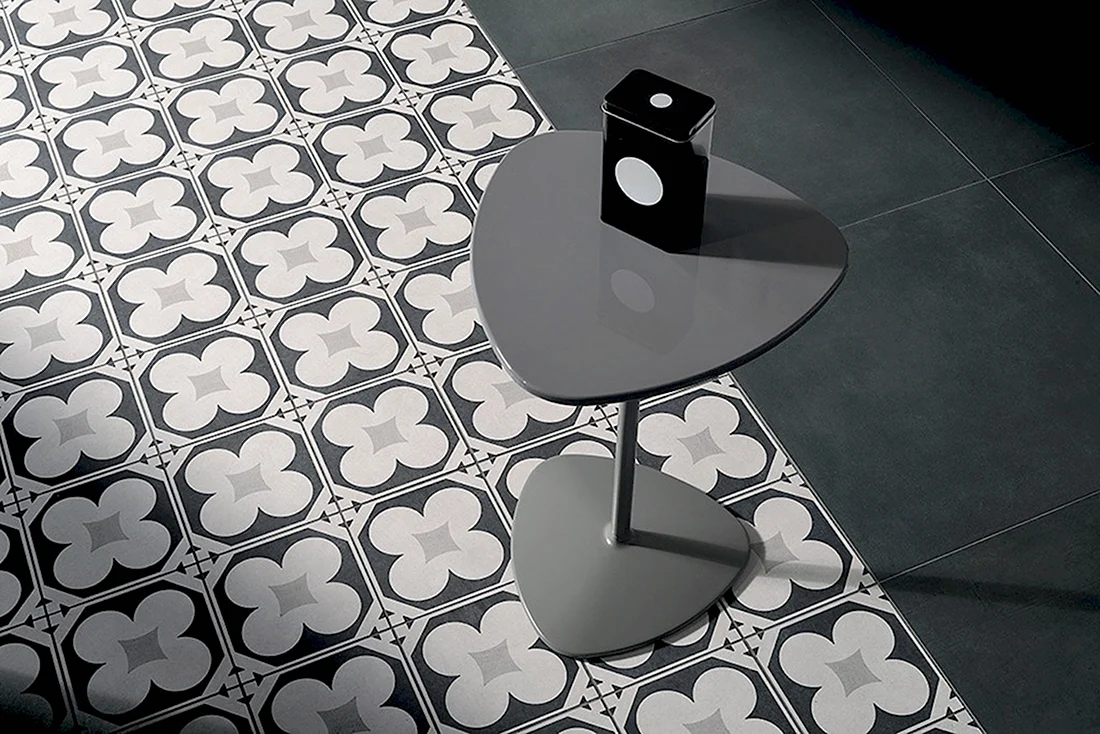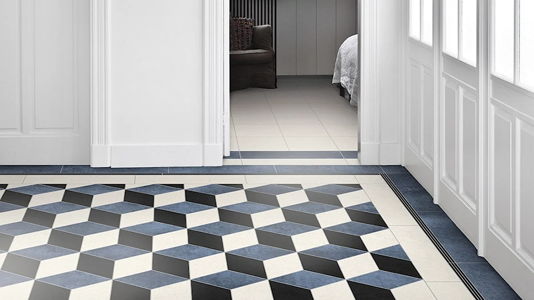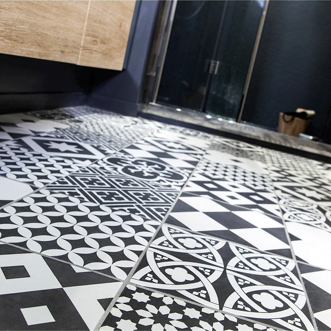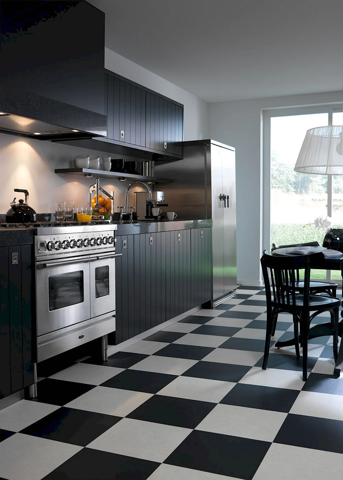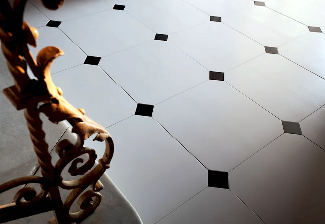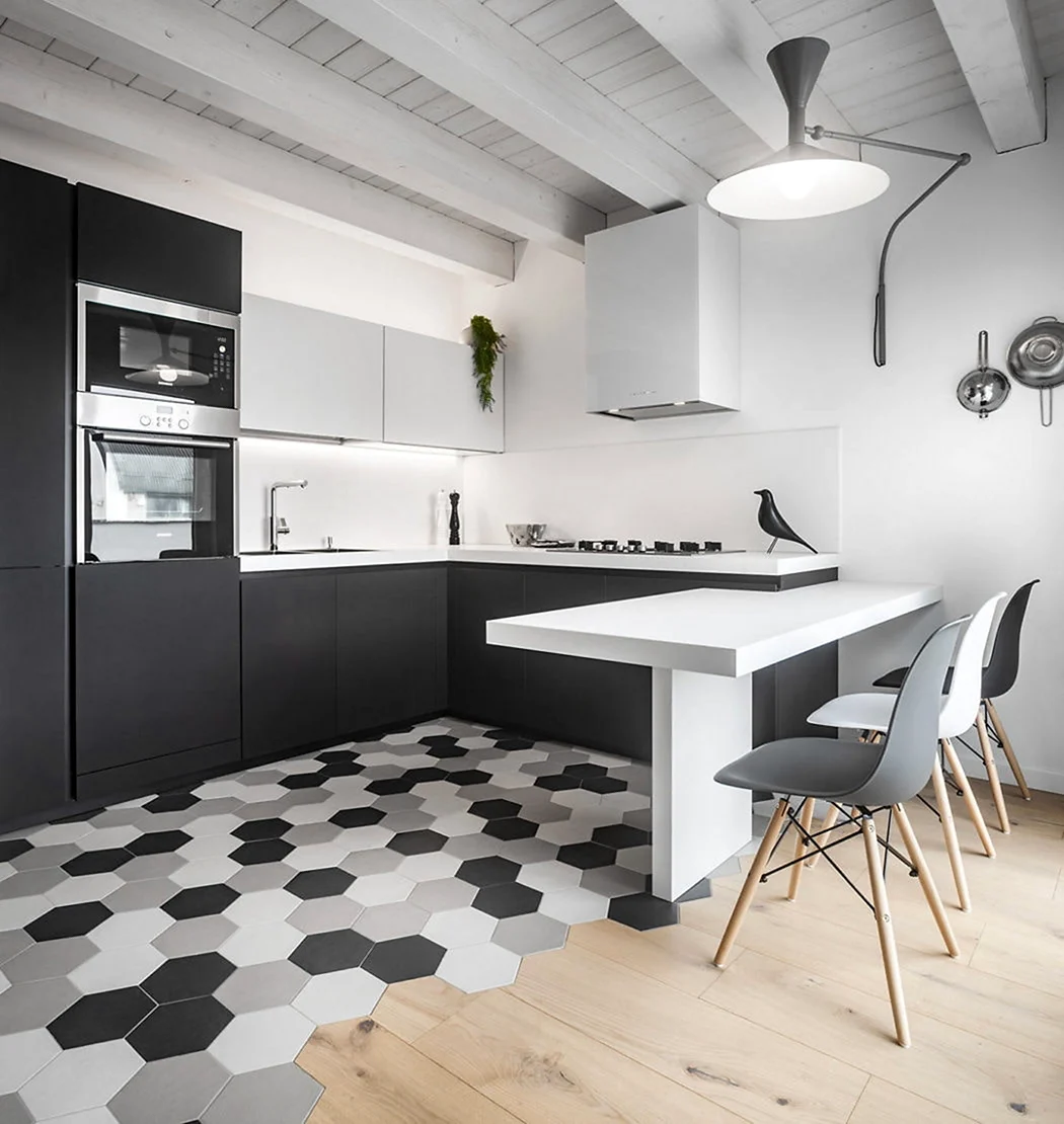 Такие черно-белые узоры на полу придают интерьеру стиль и элегантность.