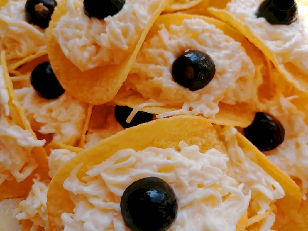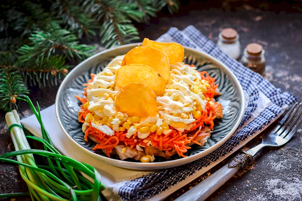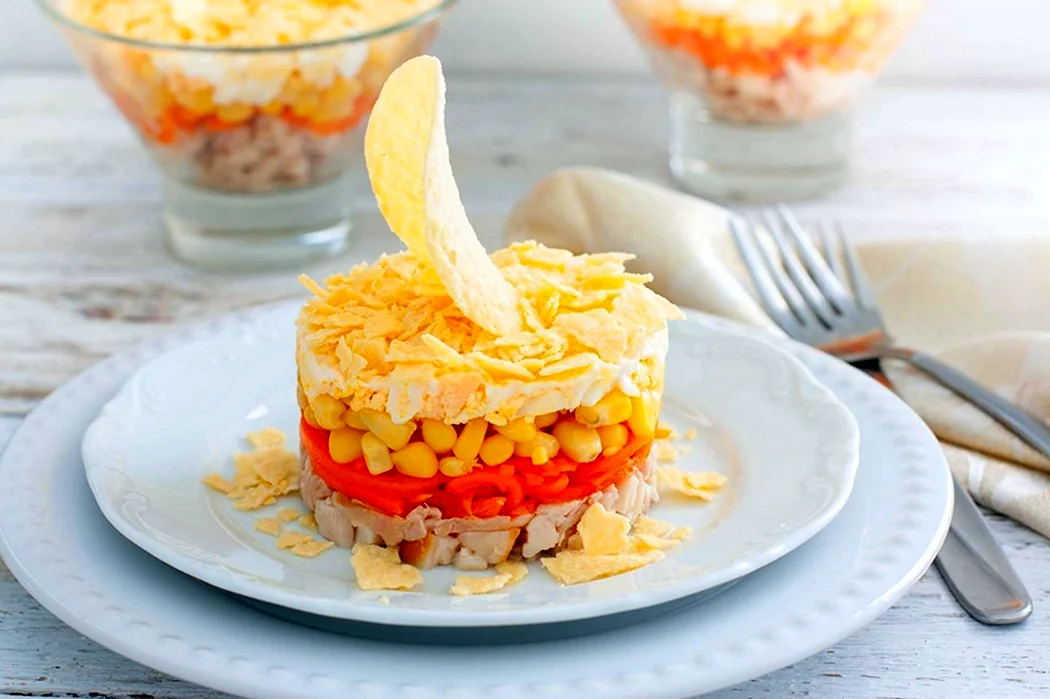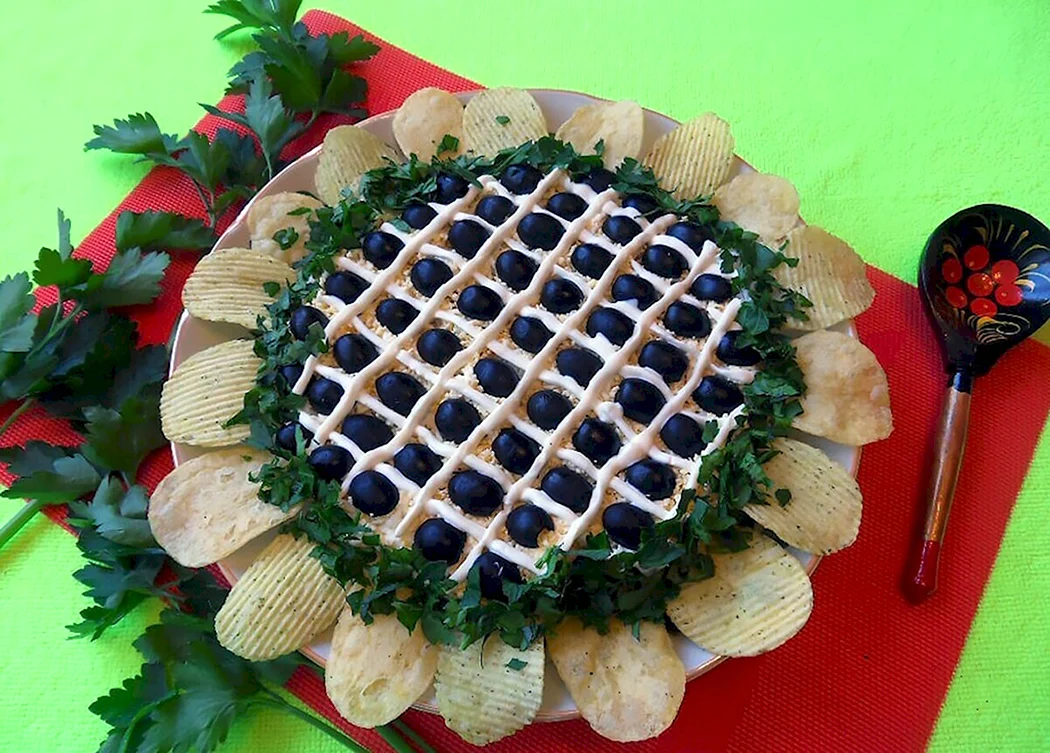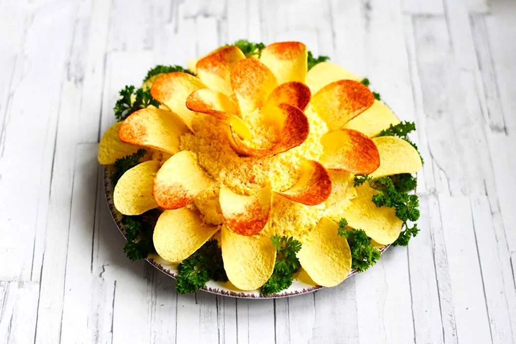 Как вкусно и красиво выглядит этот салат с оригинальным декором из чипсов!