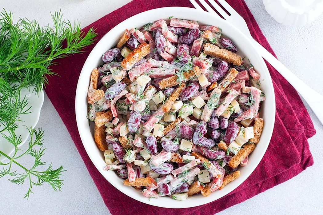 Салат с красной фасолью и копченой курицей и сухариками