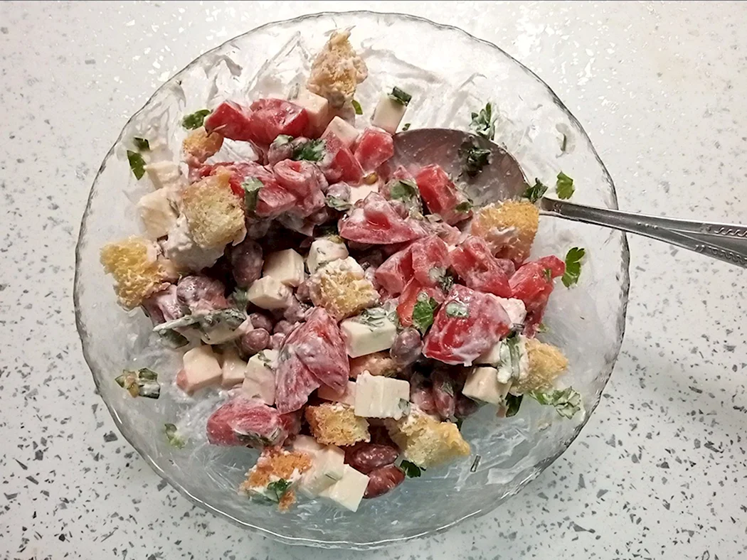 Салат с красной фасолью помидорами и сухариками
