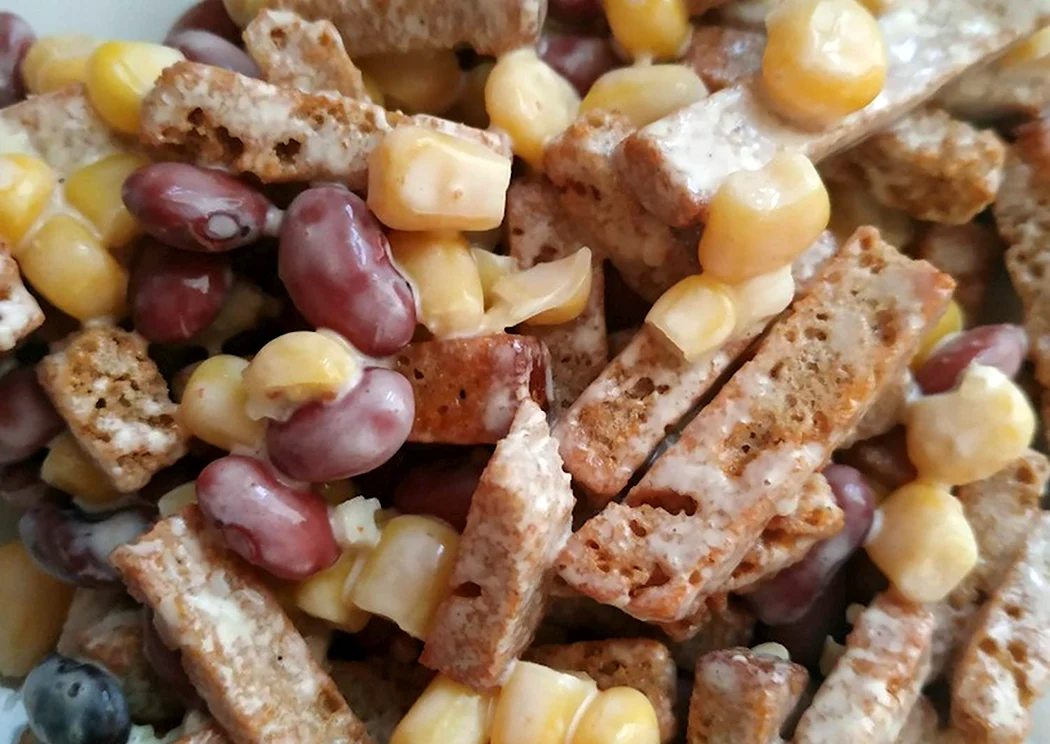 Салат с фасолью и сухариками и кукурузой