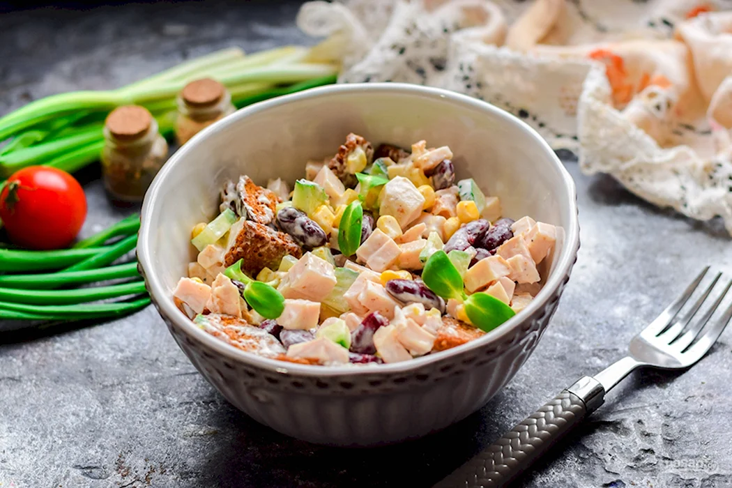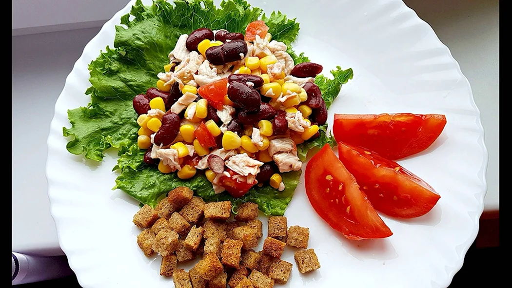 Салат с фасолью и сухариками и кукурузой и курицей