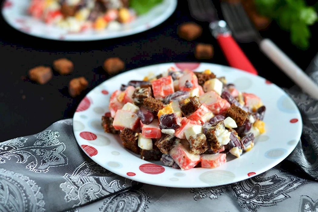 Салат с фасолью и сухариками крабовыми палочками