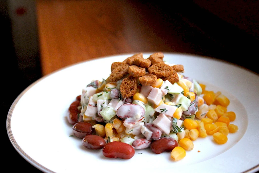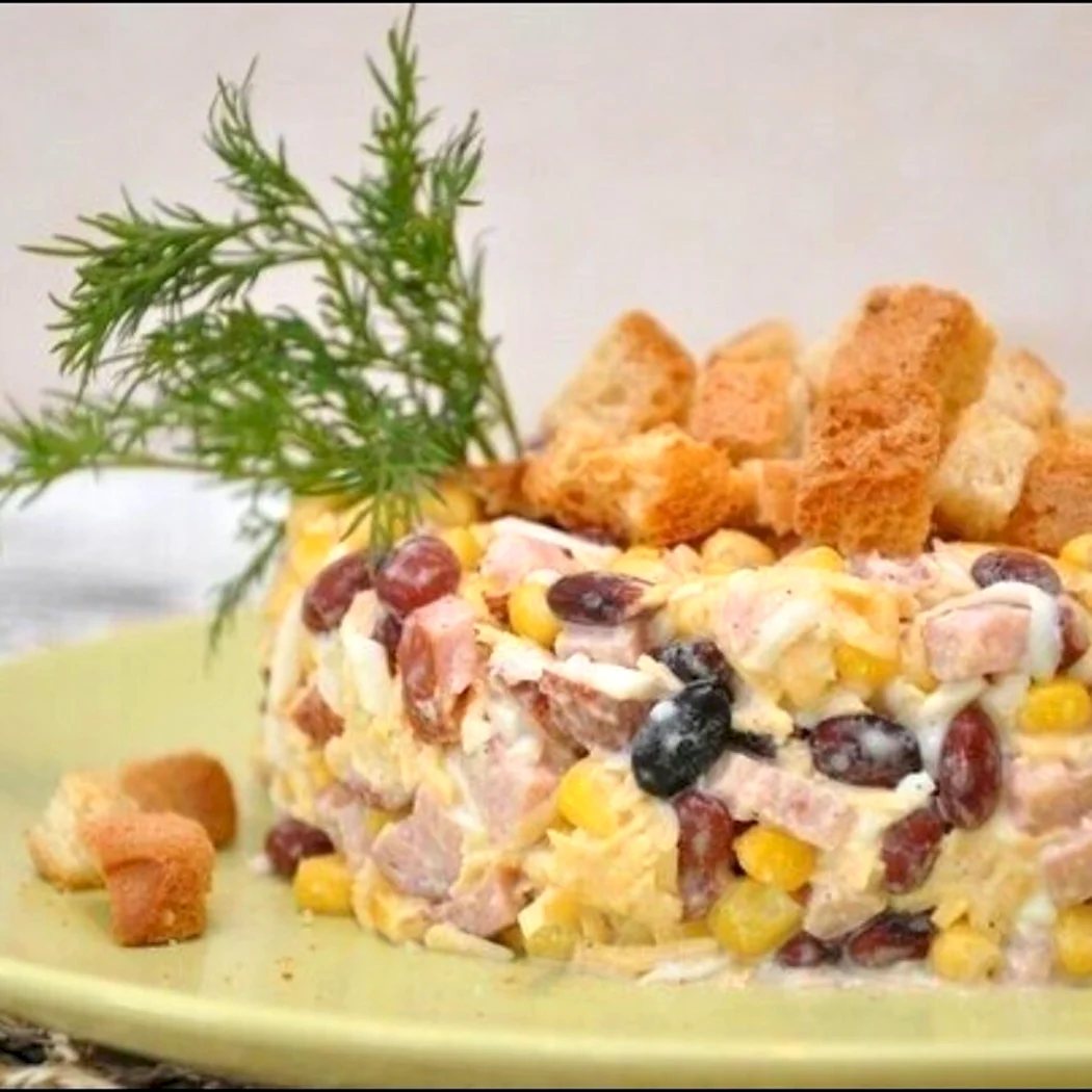 Салат ветчина фасоль кукуруза сухарики