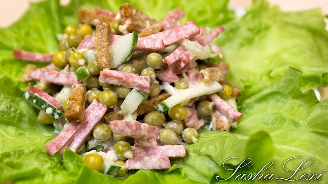 Салат с сухариками и копченой колбасой