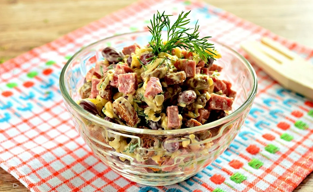 Салат с фасолью и сухариками и колбасой и кукурузой
