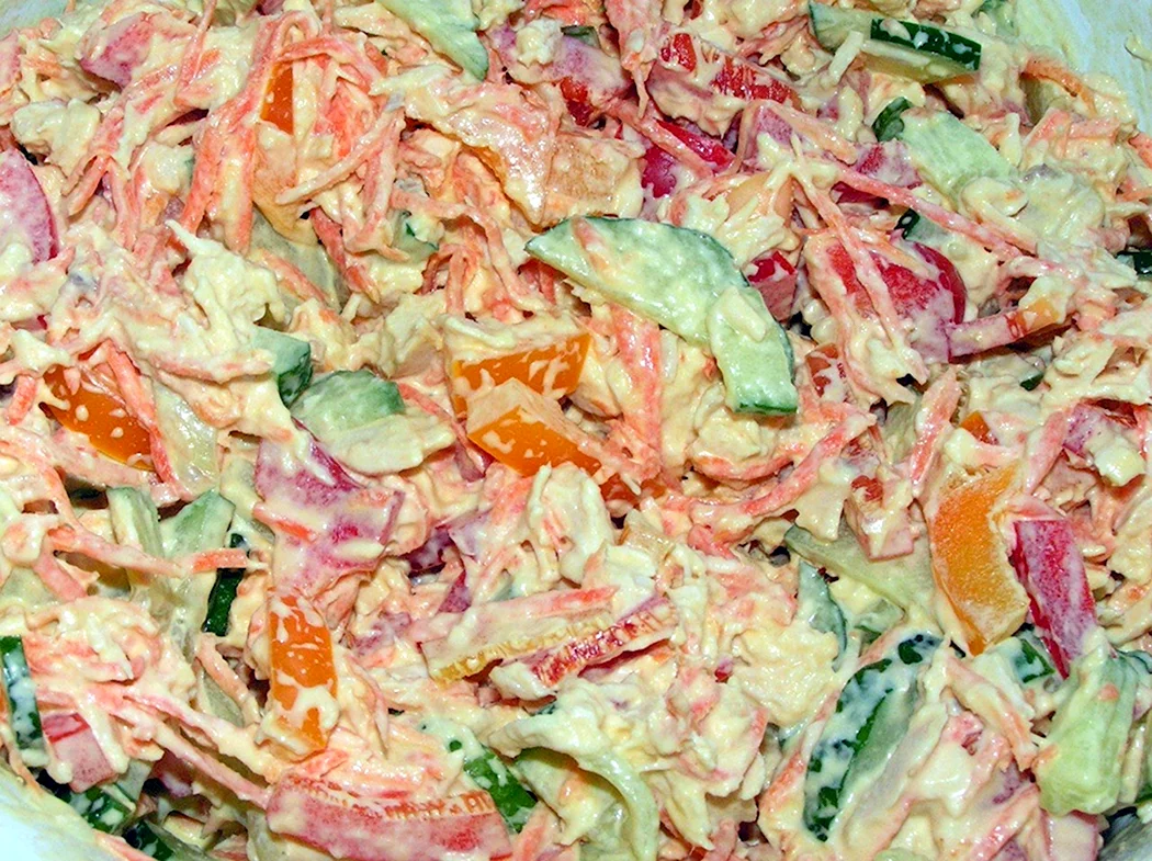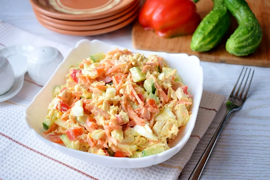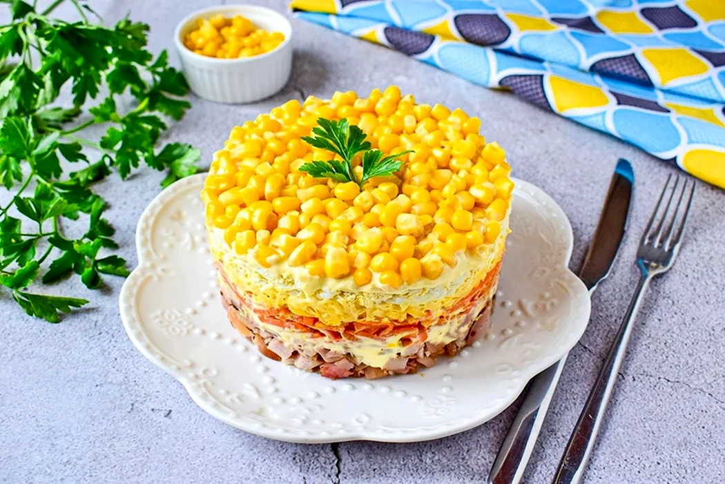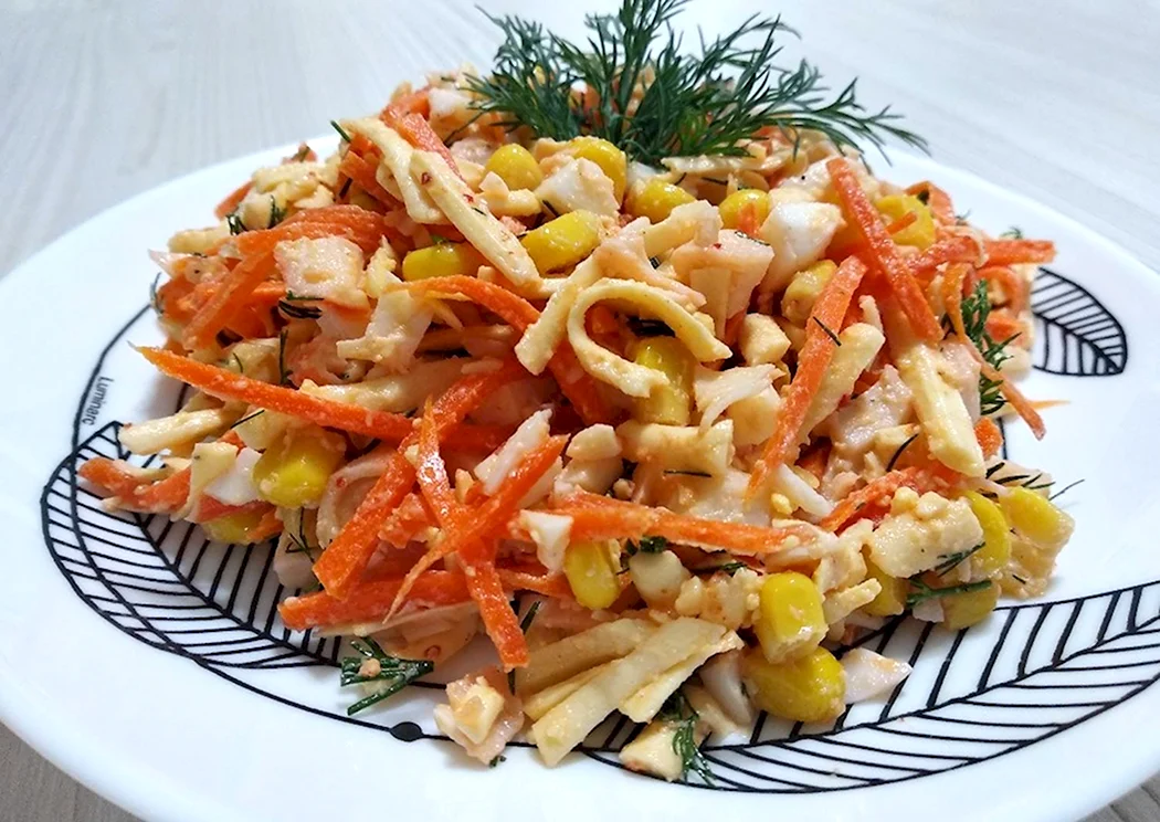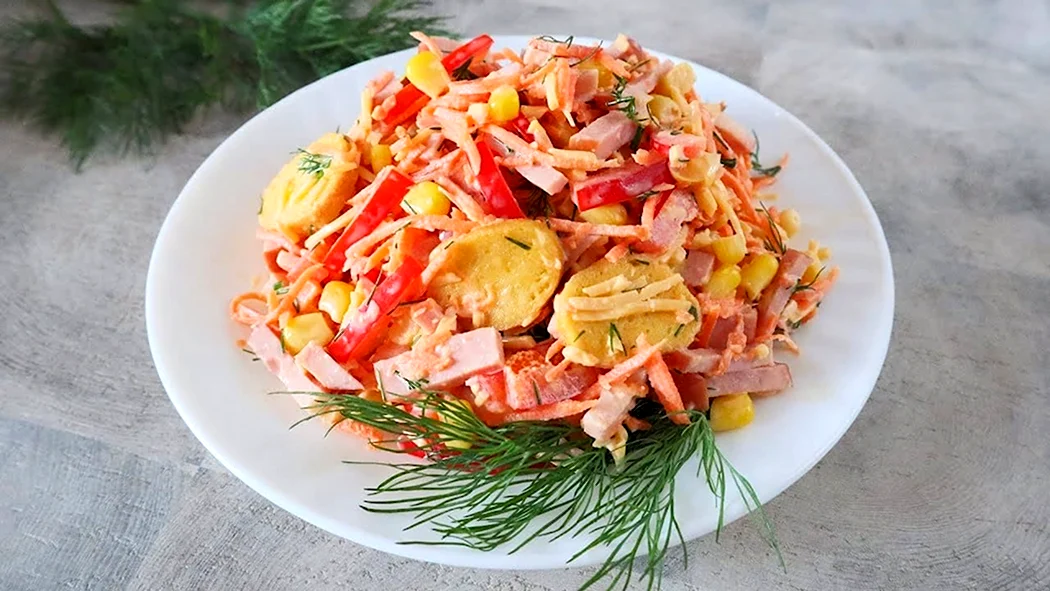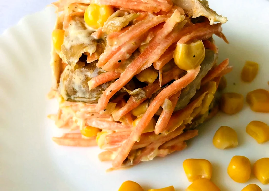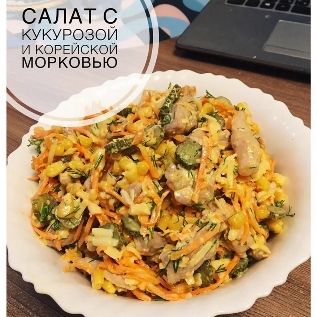 Салат с корейской морковью и копченой курицей и кукурузой и огурцом
