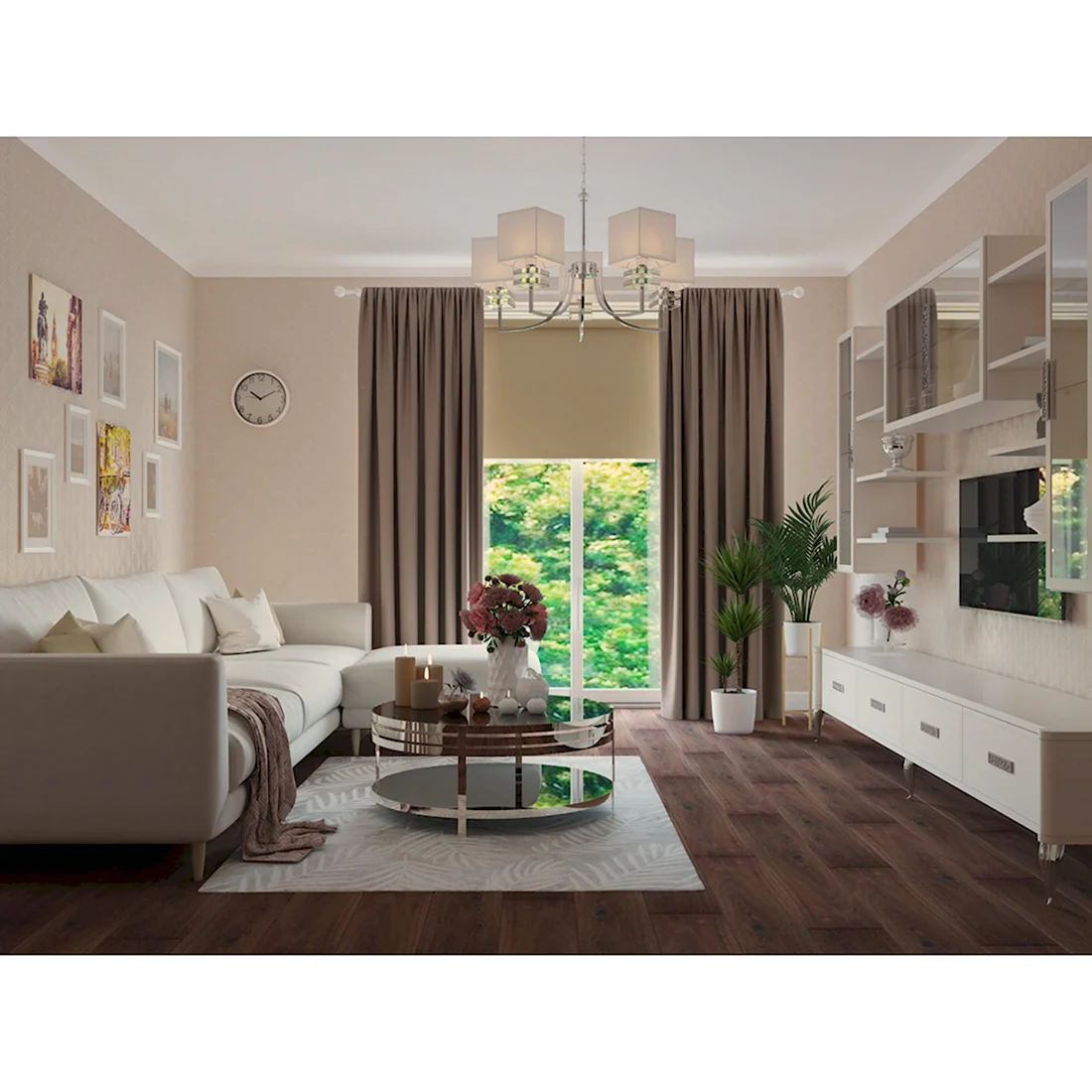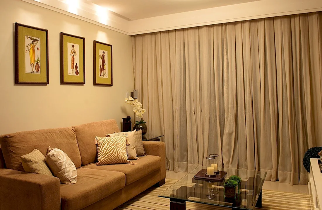 Прекрасный выбор нейтрального бежевого оттенка штор для гостиной, создавая уютную и стильную атмосферу в помещении.